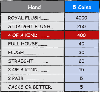 Lad os se på det oprindelige spil, der nu kaldes for draw poker eller Jacks or Better. Nedenfor kan du se udbetalingstabellen for Jacks or Better i den fulde udgave. Denne udgave af spillet har en udbetalingsprocent på 99,54 procent og en varians på 19,5.